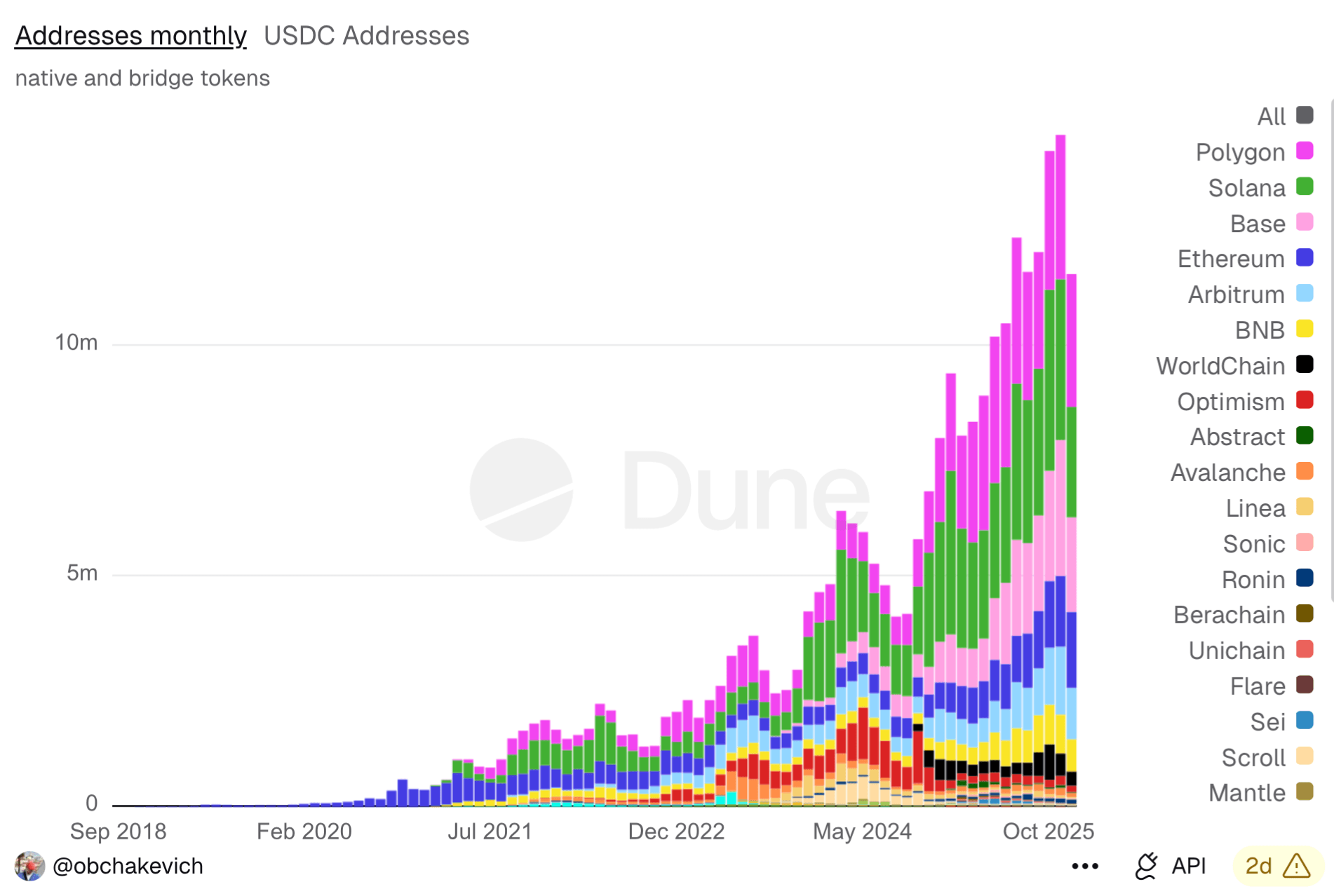 Polygon leads in new addresses using $USDC with a huge growth this year:
