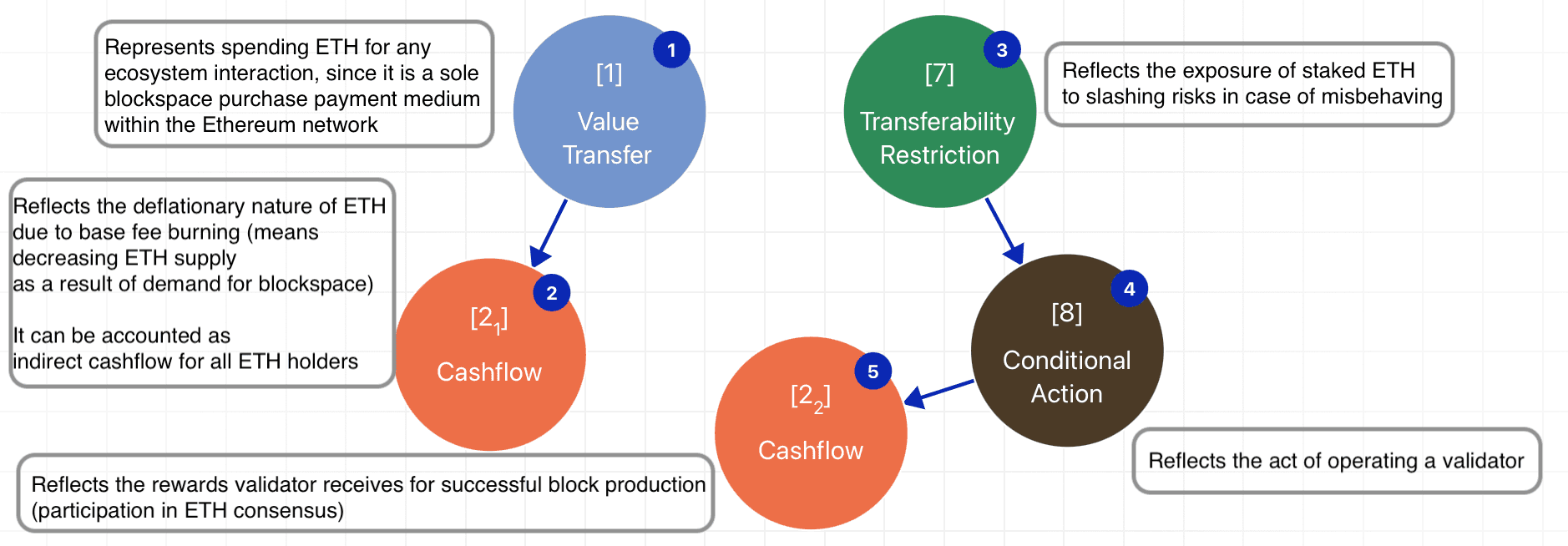 In turn, Consensus consists of Transferability Restriction (reflecting that cryptoeconomic security is ensured by using ETH as a slashable security deposit or so-called skin-in-the game by validators), Conditional Action (necessity to run validator and honestly participate in block production), and Cashflow reflects the reward for successful consensus participation activity.