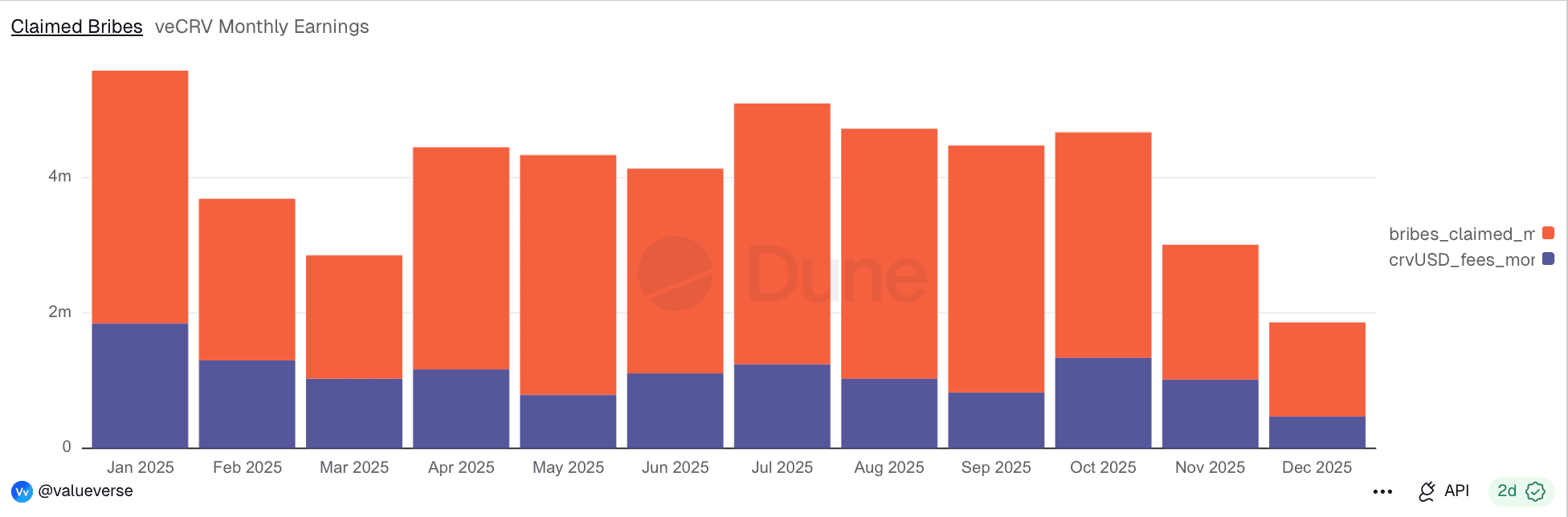 Chart featuring overall token holders revenue. Bribes and fees separately are available at https://app.valueverse.ai/tokens/curve-dao#key-metrics