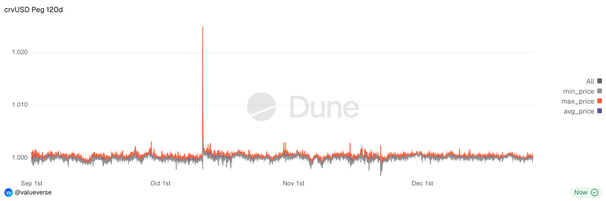 - $crvUSD peg stability: superior stability ($0.9966 minimal 120d price, $1.0001 average price)