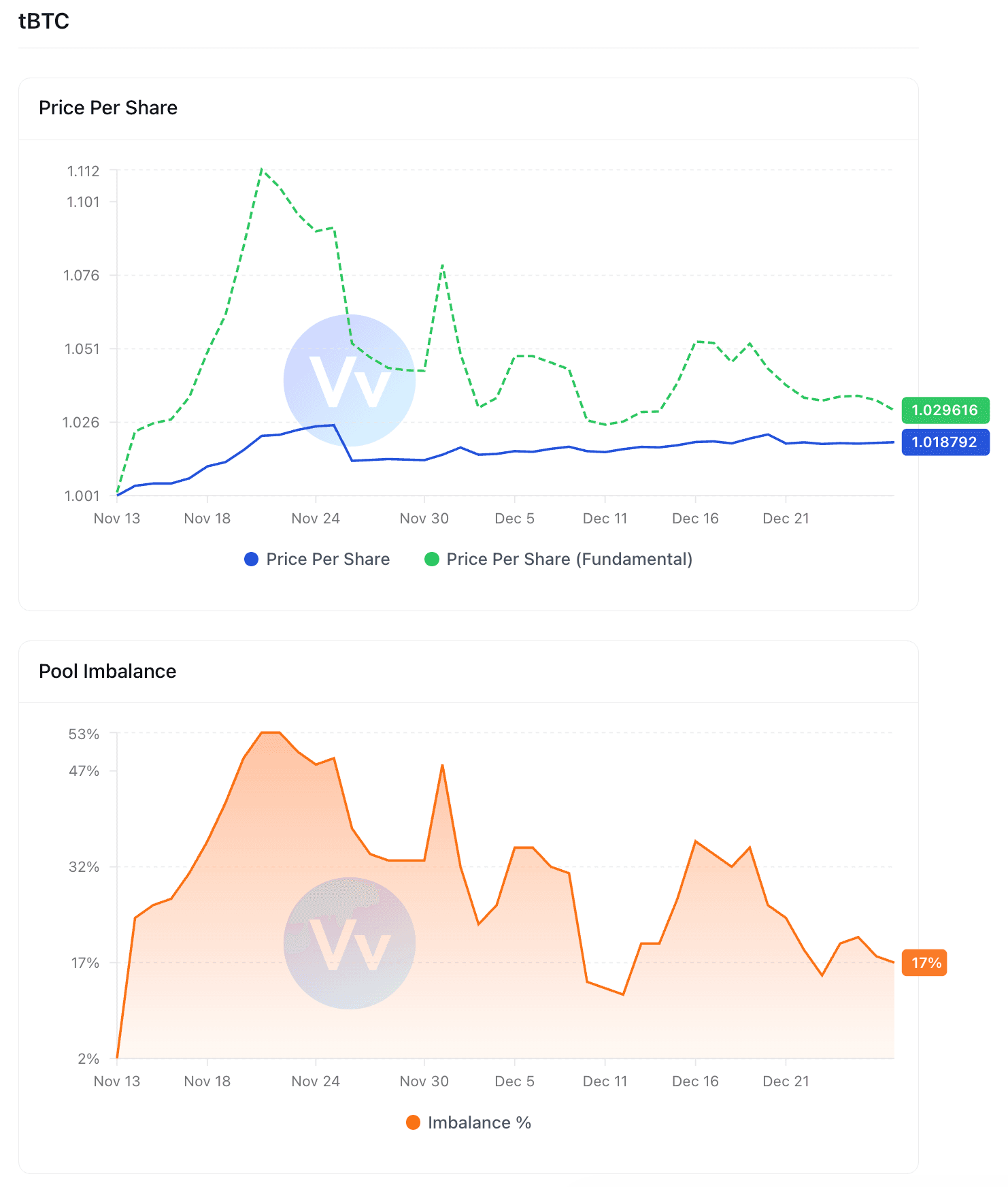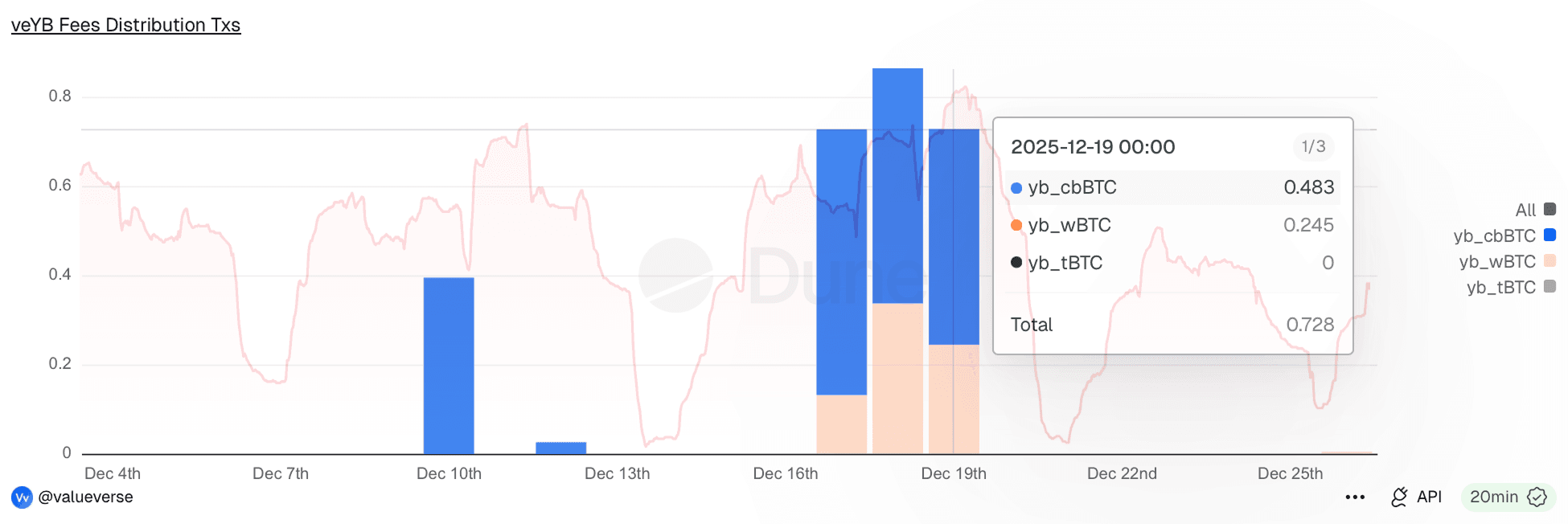 Sum: ~2.026 yb-cbBTC + ~0.719 yb-wBTC, totalling ~2.839 BTC (~$248k) accounting current redemption value. It’s important to highlight that tBTC didn’t earn any fees for veYB (poorly arbitraged & always imbalanced pool):