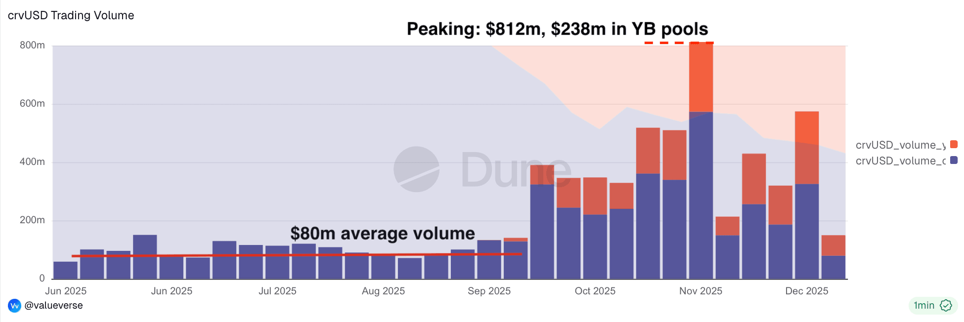 The overall weekly trading volume growth from ~$80m to an average of ~$410m (>5x growth) is a result of $crvUSD swaps in Yield Basis pools and following induced volumes in Curve $crvUSD stable pools & beyond.