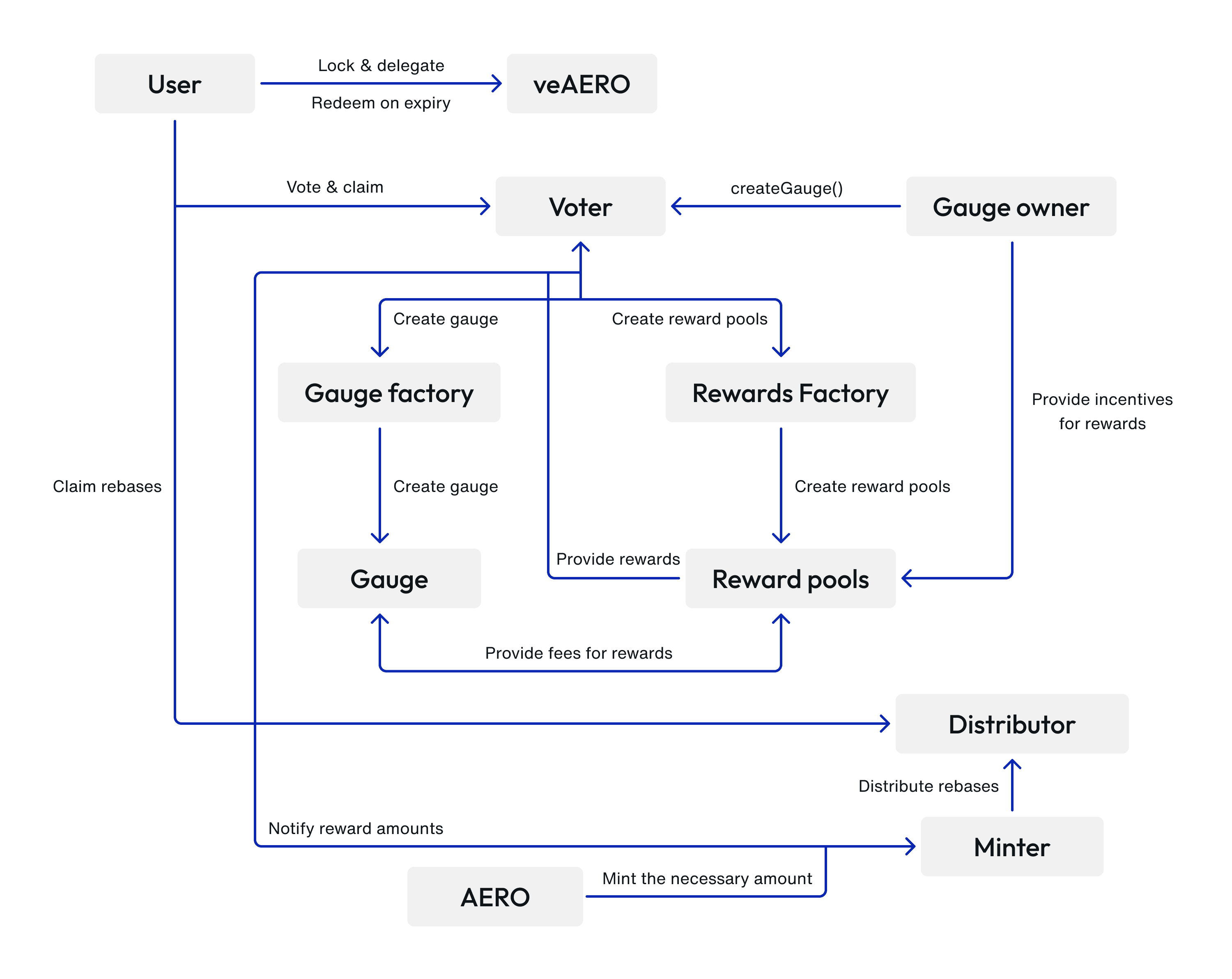 - These pools receive fees from gauges and additional incentives from gauge owners. Once the epoch concludes, rewards become claimable via Voter functions ; where the Minter contract notifies reward amounts and mints new AERO tokens as needed, while the RewardsDistributor handles the distribution of rebase rewards to veAERO holders. This creates a comprehensive system that handles both active participation rewards (voting/gauge rewards) and passive benefits (rebases).