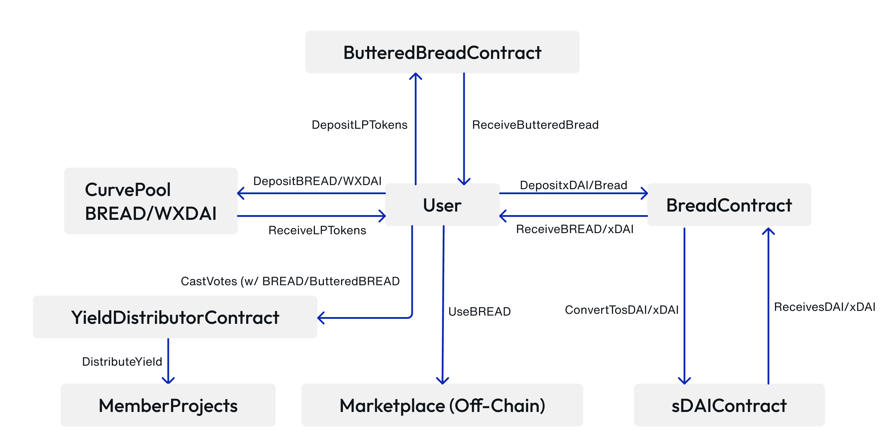 - Liquidity Provision and ButteredBread Minting Users provide liquidity to sanctioned pools (e.g., CurvePool BREAD/xDAI), receive LP tokens, and deposit them into ButteredBread.sol to mint ButteredBread tokens. These tokens grant voting power, synced with BREAD delegation.