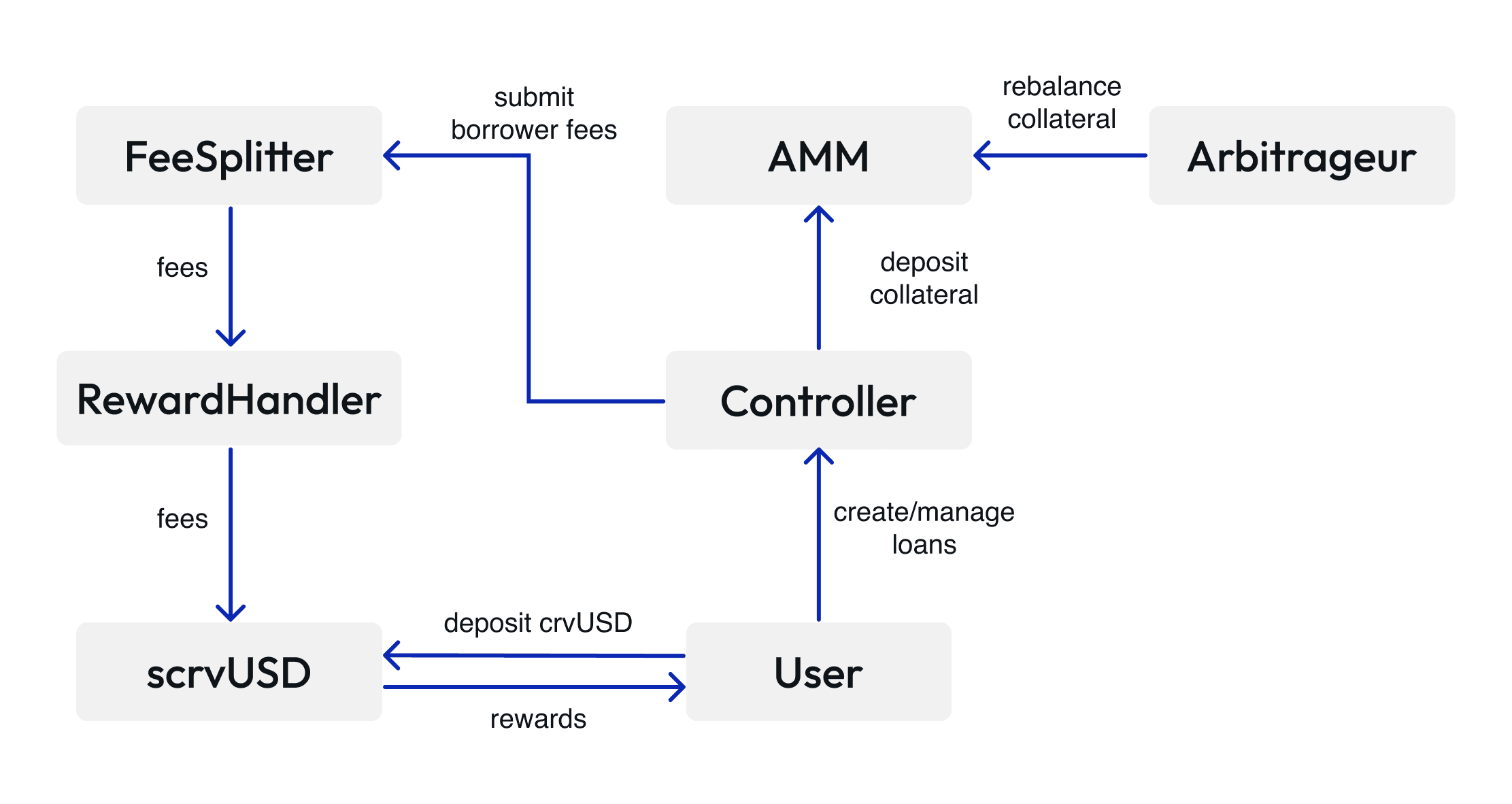 As shown above, crvUSD is not minted, but rather released when a loan is created. The user's interactive endpoint for the purposes of managing and creating loans is a market's Controller contract. When the user invokes the create_loan function of the Controller, he supplies the collateral and specifies the debt (i.e., the number of crvUSD to borrow) and the number of bands (see section 5) to spread the collateral over. Should he wish to repay the loan, an eponymous function is also available. Otherwise, collateral can be managed with add_collateral and remove_collateral, and debt can be increased with borrow_more. Hard liquidations (soft liquidations are automatic and mostly reversible) can be done with liquidate. Callback extensions are available for all these functions.