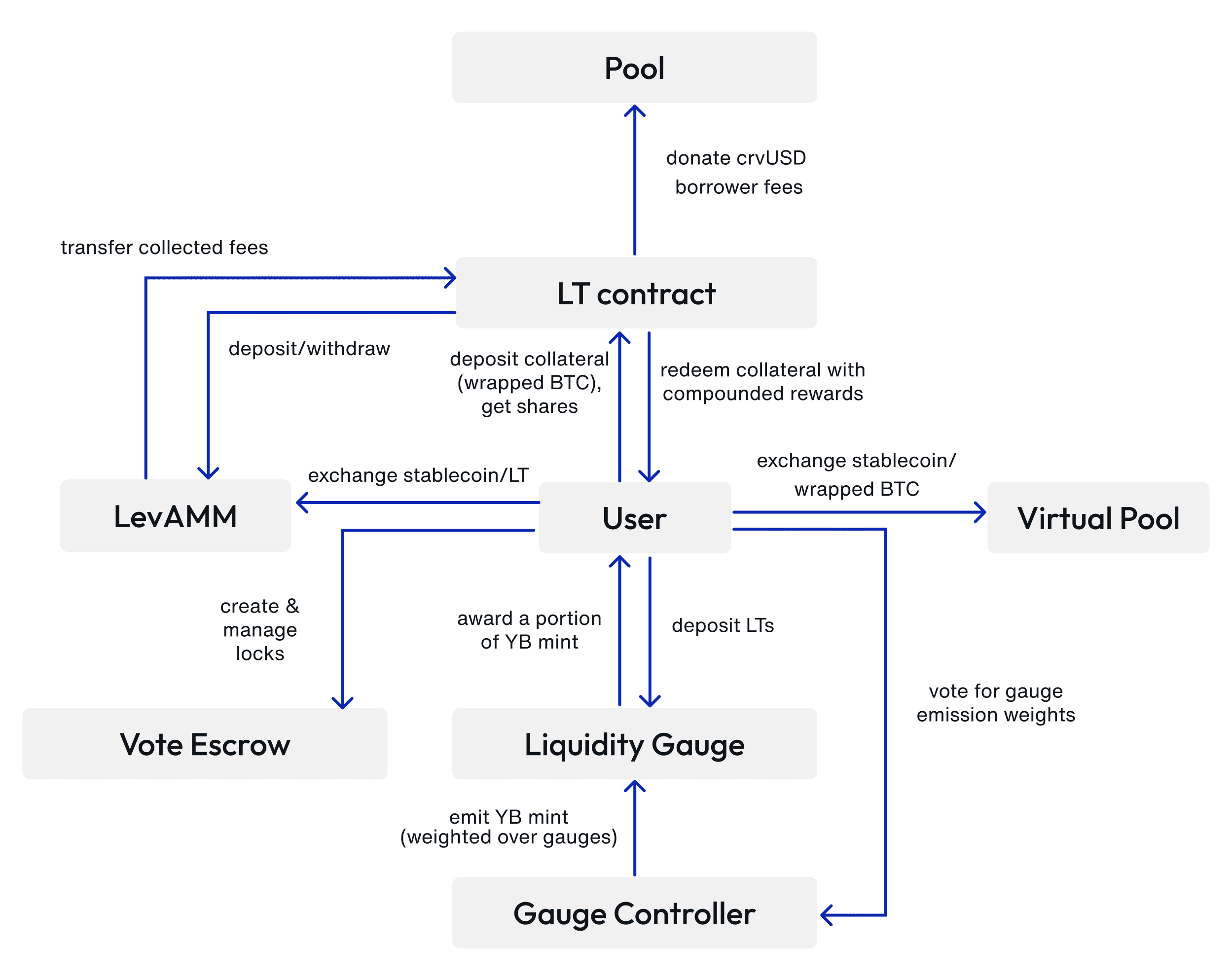 The user who wishes to deposit his BTC into a YB pool in order to make them yield-bearing invokes the deposit() method of the leveraged token (LT) contract and receives an appropriate amount of shares (that is to say, ERC4626 equivalents of ybBTC tokens). Withdrawal is handled via the withdraw() method. As in other ERC4626 pools, rewards automatically compound.